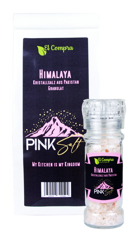 Himalaya Pink Salt Granulat in der Mühle 100g plus 1000g Nachfüllpack.